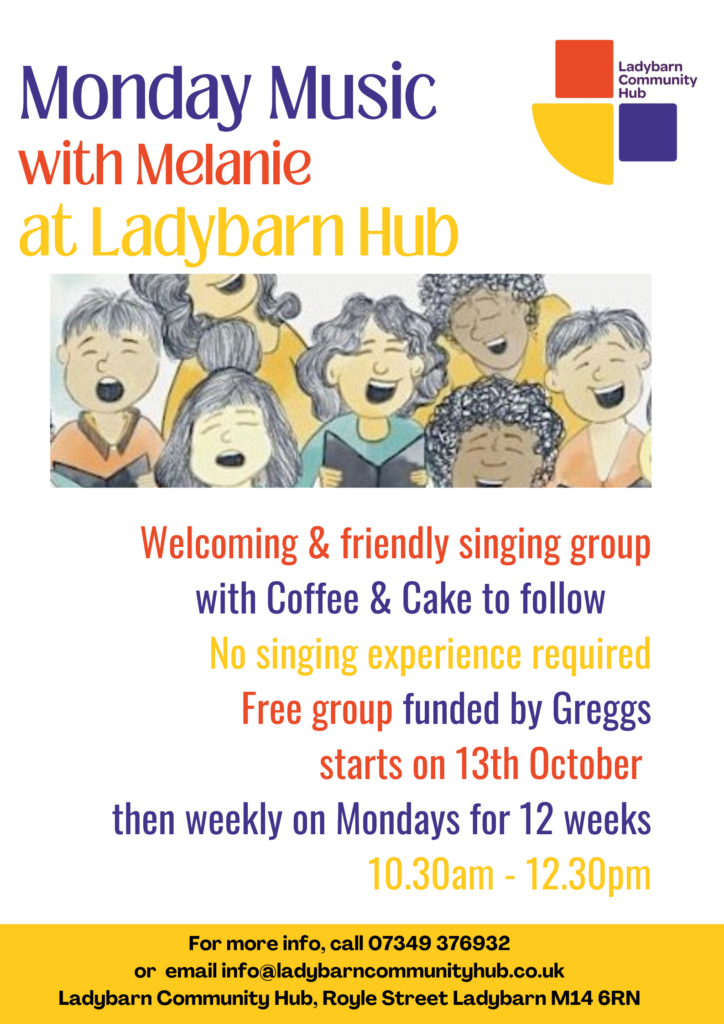 | Monday | Study Mondays 10am – 5pm Study space for students and home workers. Free Wi-Fi and unlimited tea and coffee for £1 donation. Bring your own snacks or lunch! Tai Chi 1pm – 2pm All abilities welcome and you can sit for some or all of the session. Friendly and mindful breathing and stretching. £5 per session. First session free! Over 50s Music Group (new!) 14.30pm (Starting on 13th October for 12 weeks.) Start your week off with an uplifting singing group followed by tea & cake. This is a free event funded by Greggs. Everyone welcome – no experience needed. |